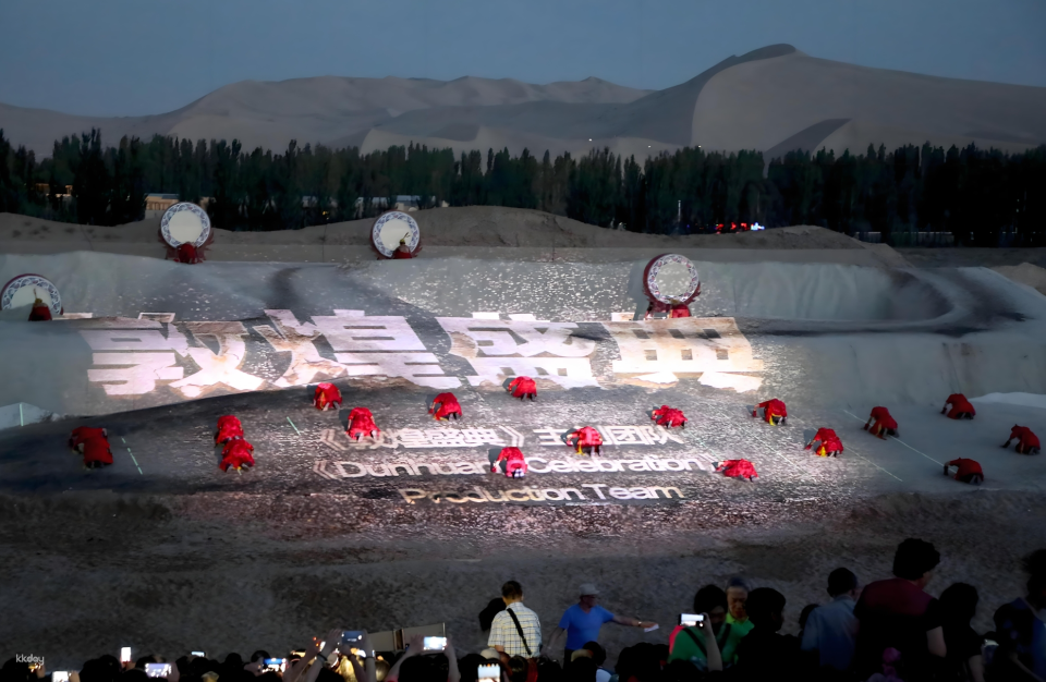 - "Dunhuang Ceremony" is based on the landscape of Mingsha Mountain and the surrounding mountain ranges, where the peaks stand out, the valleys are magnificent, and the mist and smoke in the sky are flying. Looking around, the Mingsha Mountain in the distance and the nearby sand dunes surround the theater, and the blue moon spring and rippling waves have become the constituent elements of the live performance theater. The uncanny craftsmanship of nature has been sublimated to the extreme, with real mountains and rivers, and the real scene performs an immortal piece. The Silk Road legend has created a spectacular desert real-life theater.