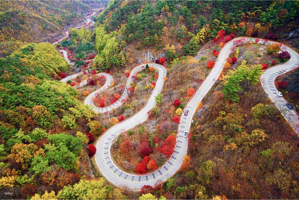 Bobaljae Maple Road is a stunning mountain pass in Danyang famous for its winding roads, scenic viewpoints, and breathtaking nature. During autumn, the road transforms into a spectacular tunnel of fiery red, orange, and yellow maple leaves, making it one of the most beautiful fall foliage drives in Korea. In other seasons, visitors can enjoy lush green landscapes in summer and peaceful snowy scenes in winter. Perfect for a leisurely drive, cycling, or photography, this scenic route offers a refreshing break surrounded by nature.