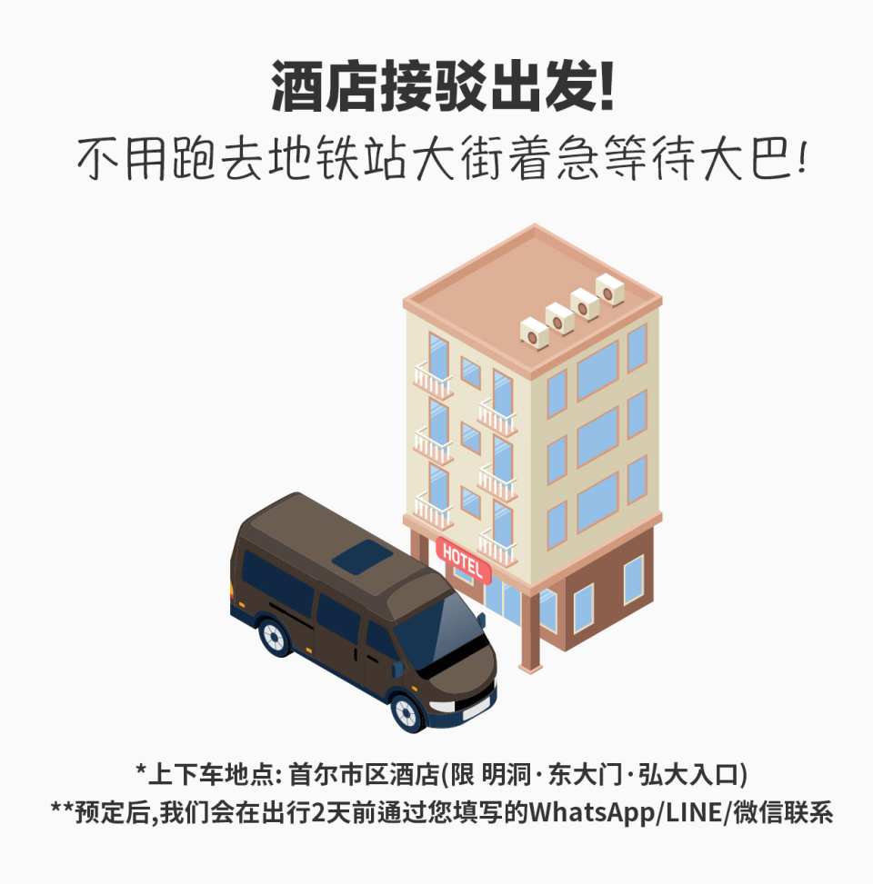 • Vehicle boarding location: Hotel lobby in Seoul (limited to Myeongdong/Dongdaemun/Hongdae area)