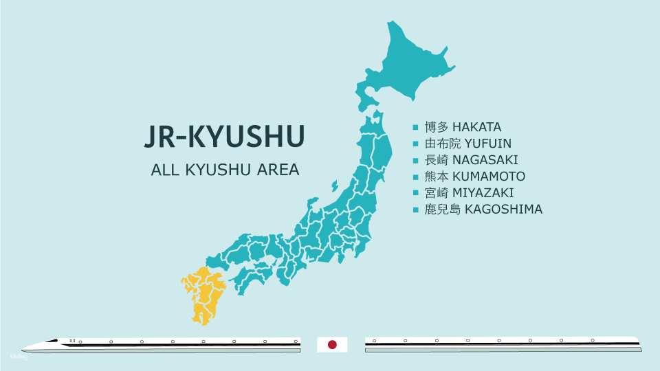 • Northern Kyushu: Shimonoseki, Mijiko, Kokura, Hakata, Yufuin, Beppu, Oita, Kumamoto, Aso, Sago, Nagasaki, Huis Ten Bosch, and Sasebo. (Available Shinkansen: Hakata – Kumamoto)