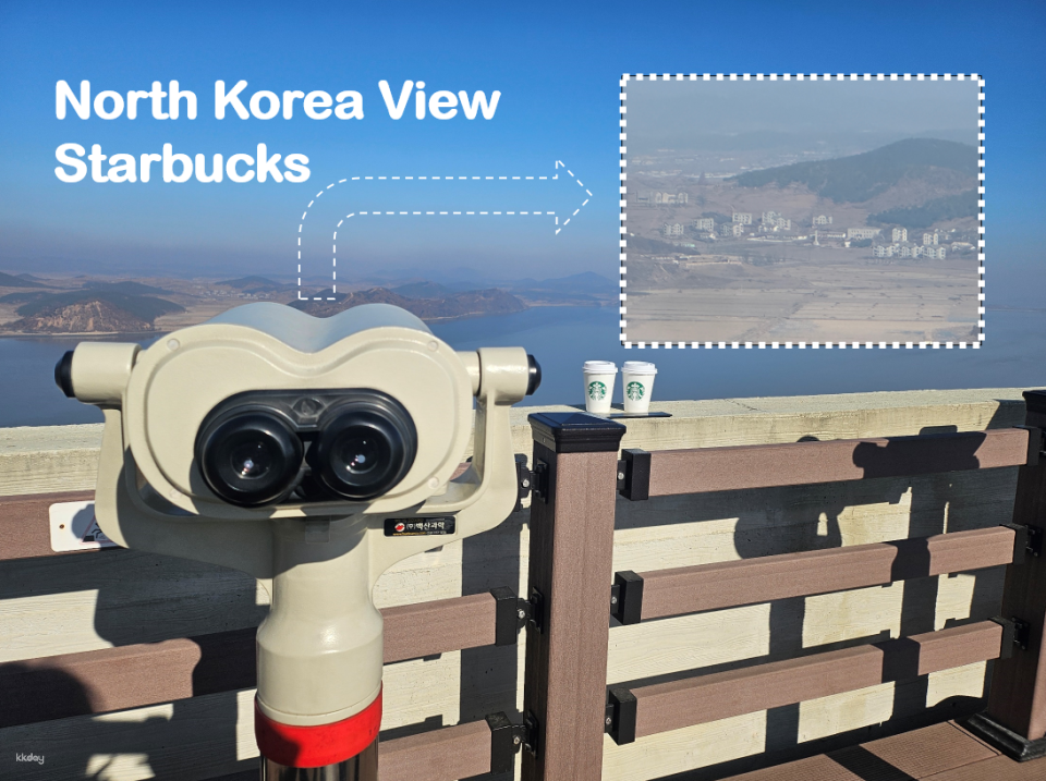 You can see the open sky, the flowing river, and the North Korean land beyond from Starbucks.